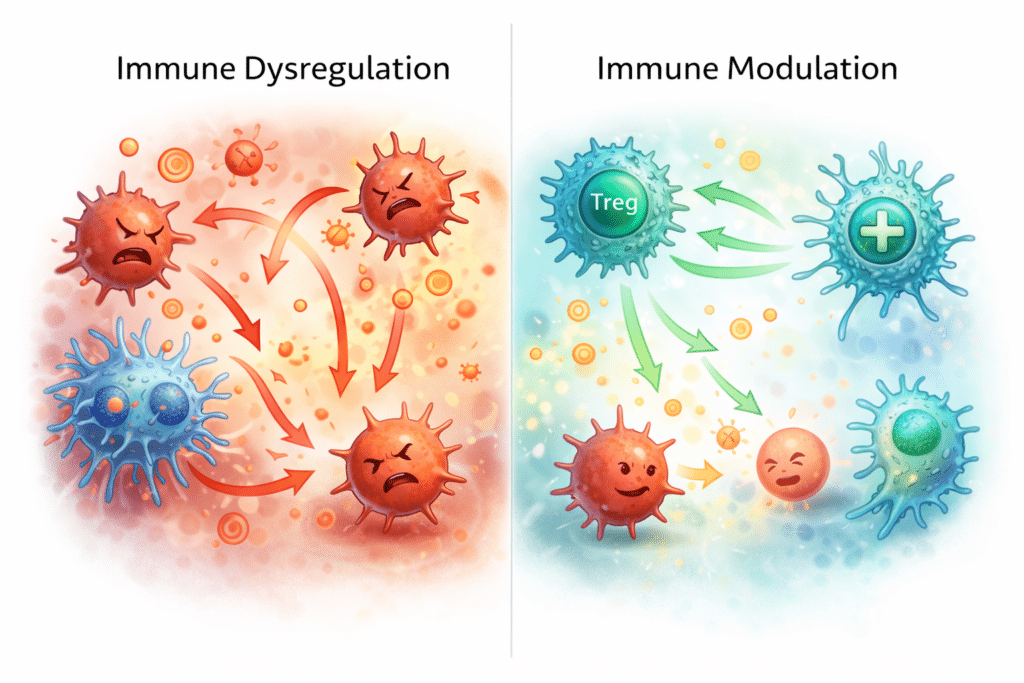 Immunomodulation takes a different approach. Rather than suppressing immune activity or forcing endocrine compensation, it aims to restore proportional immune signaling—allowing inflammatory responses to occur when appropriate and resolve when their function is complete.