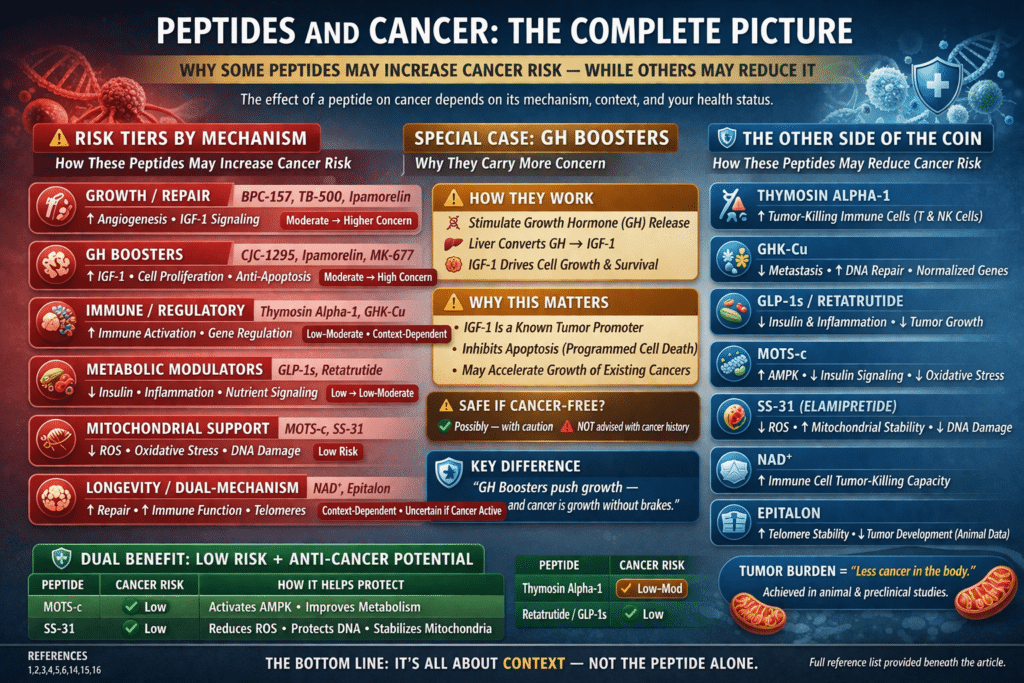 As with other growth-aligned peptides, the key distinction is not whether these compounds “cause” cancer, but whether they support the biological conditions that allow cancer to progress.