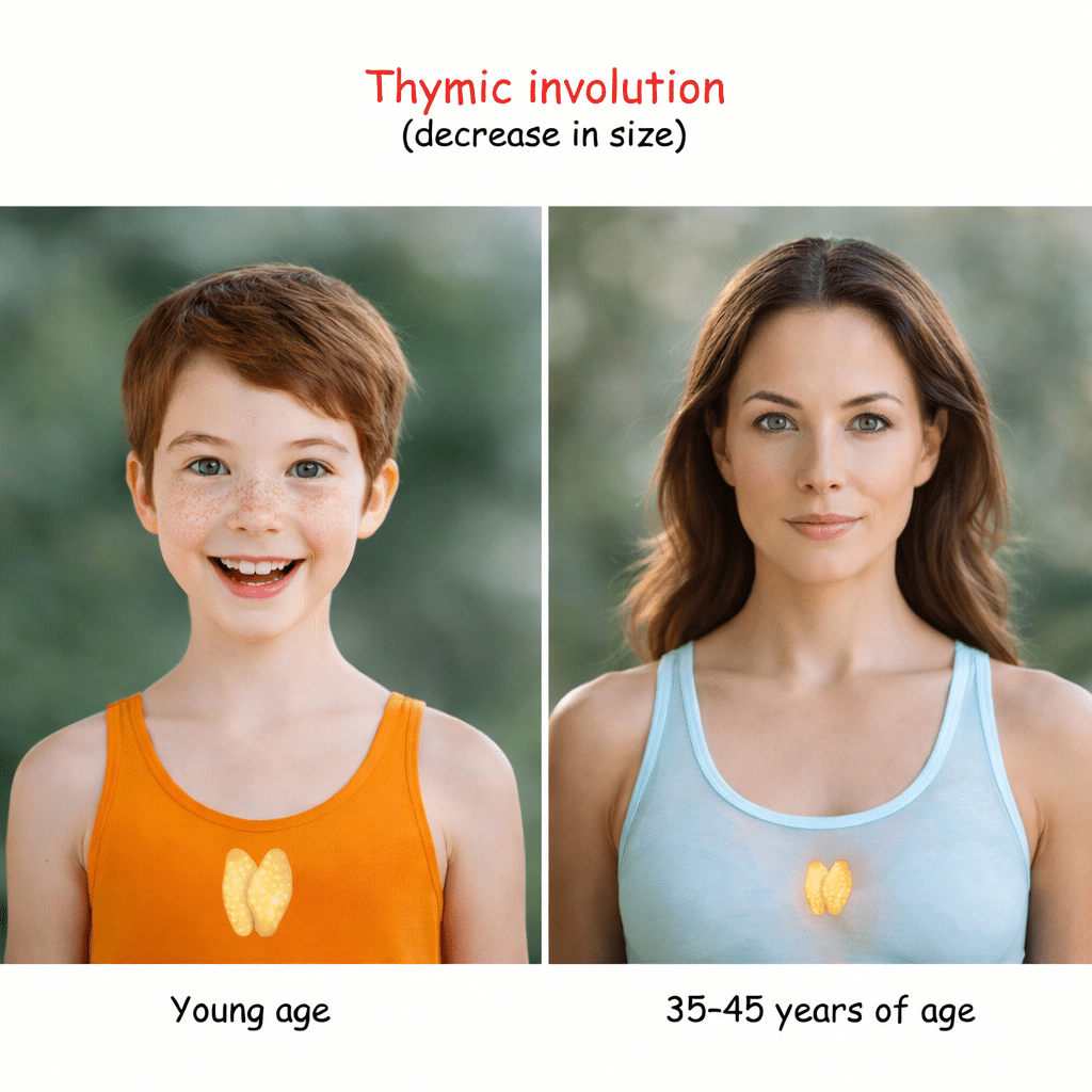 One of the most important contributors is age-related immune remodeling. The thymus, which plays a central role in training T lymphocytes, gradually involutes with age. This process reduces the output of naïve and regulatory T cells while skewing immune balance toward memory and effector populations.5 The immune system does not simply become weaker; it becomes less precise and less capable of resolution.